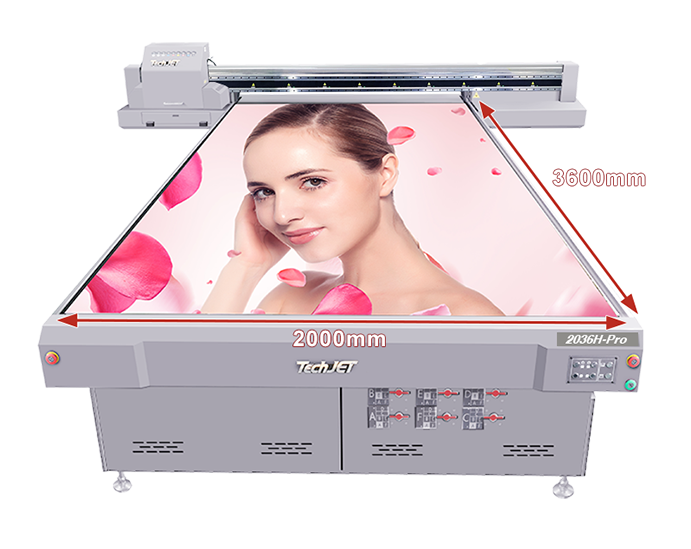The 2036H-Pro is an industrial-grade UV printer with a large 2000×3600mm printing area. Equipped with Ricoh Gen6 printheads, an X-axis high-speed magnetic linear drive control and a Y-axis dual magnetic scale closed-loop motion control system, it delivers high-speed, high-precision printing, enabling more efficient and stable production of advertising boards, display panels, and decorative materials.