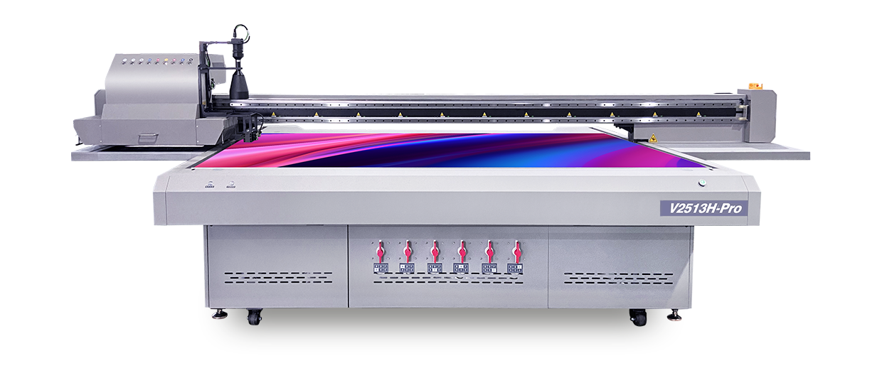 The V2513H-Pro is an industrial-grade UV printer with a large 2500×1300mm printing area. Equipped with Ricoh Gen6 printheads and visual positioning system. an X-axis high-speed magnetic linear drive control and a Y-axis dual magnetic scale closed-loop motion control system, it delivers high-speed, high-precision printing, enabling more efficient and stable production of advertising boards, display panels, and decorative materials.